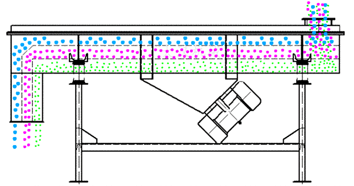 多層直線振動篩篩結構與直線篩結構一樣,主要由篩箱、篩框、篩網、振動電機、電機臺座、減振彈簧、支架等組成。采為雙振動電機驅動,當物料從給料機均勻地進入篩分機的進料口時,兩臺電機通過同步、反向旋轉時所產生的激振力在平行于電機軸線的方向相互抵消,在垂直于電機軸的方向疊為一合力,在激振力和物料自重力的共同作用下,使物料在篩面上被拋起向前作直線運動,物料通過多層篩網產生數種規格的篩上物、篩下物,然后又分別從各自的出口排出,從而達到篩分的目的。