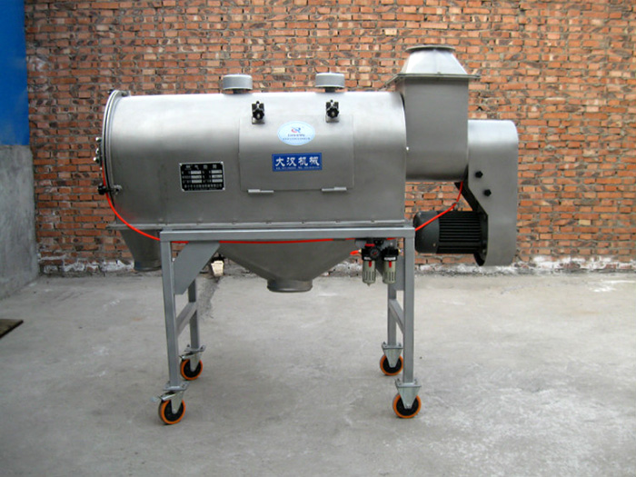氣流篩分機主要是由電機、機座、篩箱、進出料推進裝置等部分組成的。本設備篩網為圓筒狀,置于機體內,作業時物料不是直接投放到篩體內,而是經由一截螺旋輸送機送入,篩箱內的分流葉片高速連續轉動,將送入的物料吹起沖向圓筒狀的篩網,細料透過篩網進入成品儲料室,粗料從出料口流出。