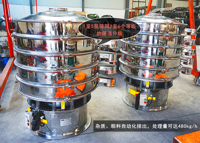 生石灰旋振篩可篩1至5層篩網,能同時進行2至6個等級的篩選分級,雜質、粗料自動化排出,處理量可達480kg/h。