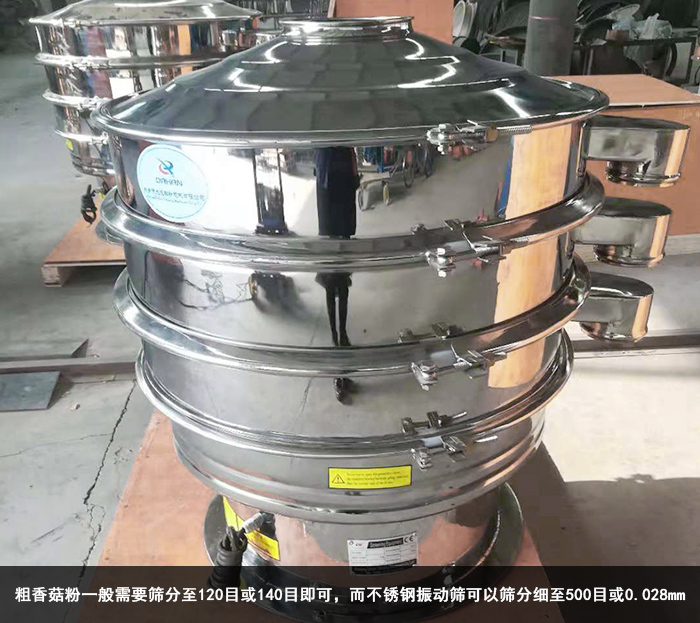 不銹鋼振動篩篩分細至500目或0.028mm,而將粗香菇粉一般需要篩分至120目或140目即可,所以符合不銹鋼振動篩符合香菇粉篩分精度的要求。