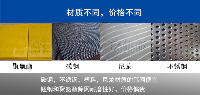 按照振動(dòng)篩網(wǎng)材質(zhì)劃分主要由碳鋼、不銹鋼、錳鋼、塑料、尼龍、聚氨酯等多種,其價(jià)格的差異主要是在原材料上,一般來說,碳鋼,不銹鋼,塑料,尼龍材質(zhì)的篩網(wǎng)會(huì)比較便宜,而錳鋼和聚氨酯篩網(wǎng)耐磨性好,所以其價(jià)格會(huì)偏貴一些。